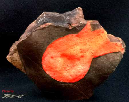 I guess bird really is the word when it comes to this piece. This isn’t just any bird however, it may be one of humankind’s first artistic representations of a fabled firebird. Not to be confused with the latter manifestations of a firebird among Native American tribes, this bird has a meaning all its own. The large rounded white limestone that comprises the bird’s eye also serves to express the stone’s meaning. In this, and various other stones, the color white is utilized to represent intense heat. The same type of intense heat that would accompany a seriously hot fire. As for the primary symbol that I’ve highlighted in red, it too conveys the meaning of intense heat. In fact it was no doubt the source.