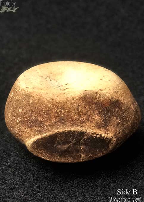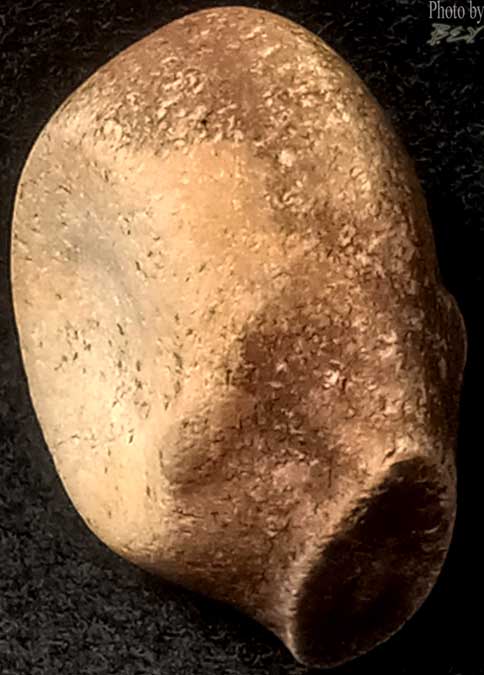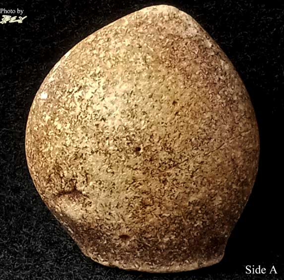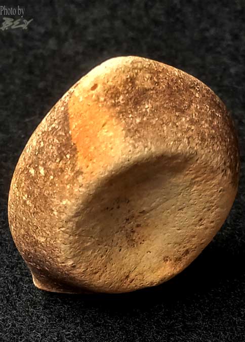 If you look carefully you can see that this stone has a small depression or divot at its center. The divot is circular, uniform in shape, and appears to have been made by tooling⁴ as opposed to being depressed by hand (more specifically a finger). The opposite side is smooth and flat and absent a similar depression.